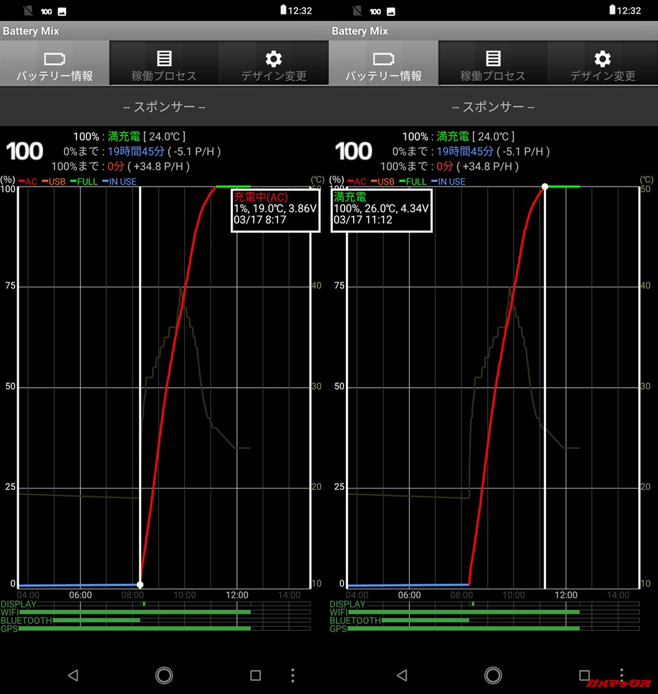 充電時間の検証は付属の充電器とケーブルを利用してバッテリーが空の状態から満充電までの時間を測定しています。起動後にアプリを立ち上げるので数%の誤差はご了承下さい。