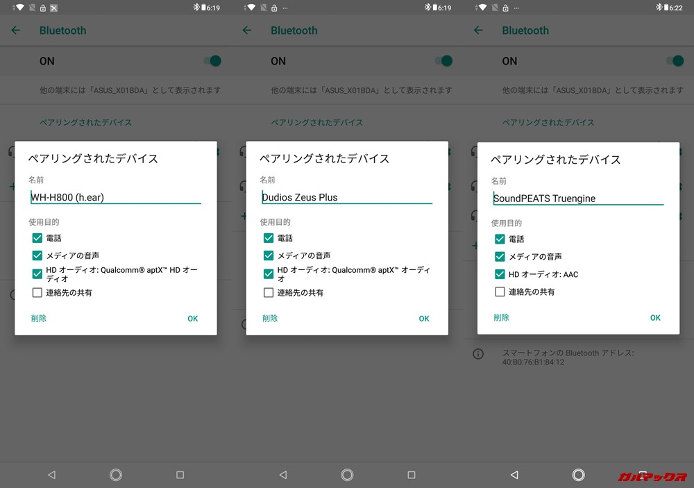 ▼という訳で、ZenFone Max Pro (M2)が対応するBluetoothコーデックを実際に様々なコーデックに対応する機器を接続して調べてみました。↓